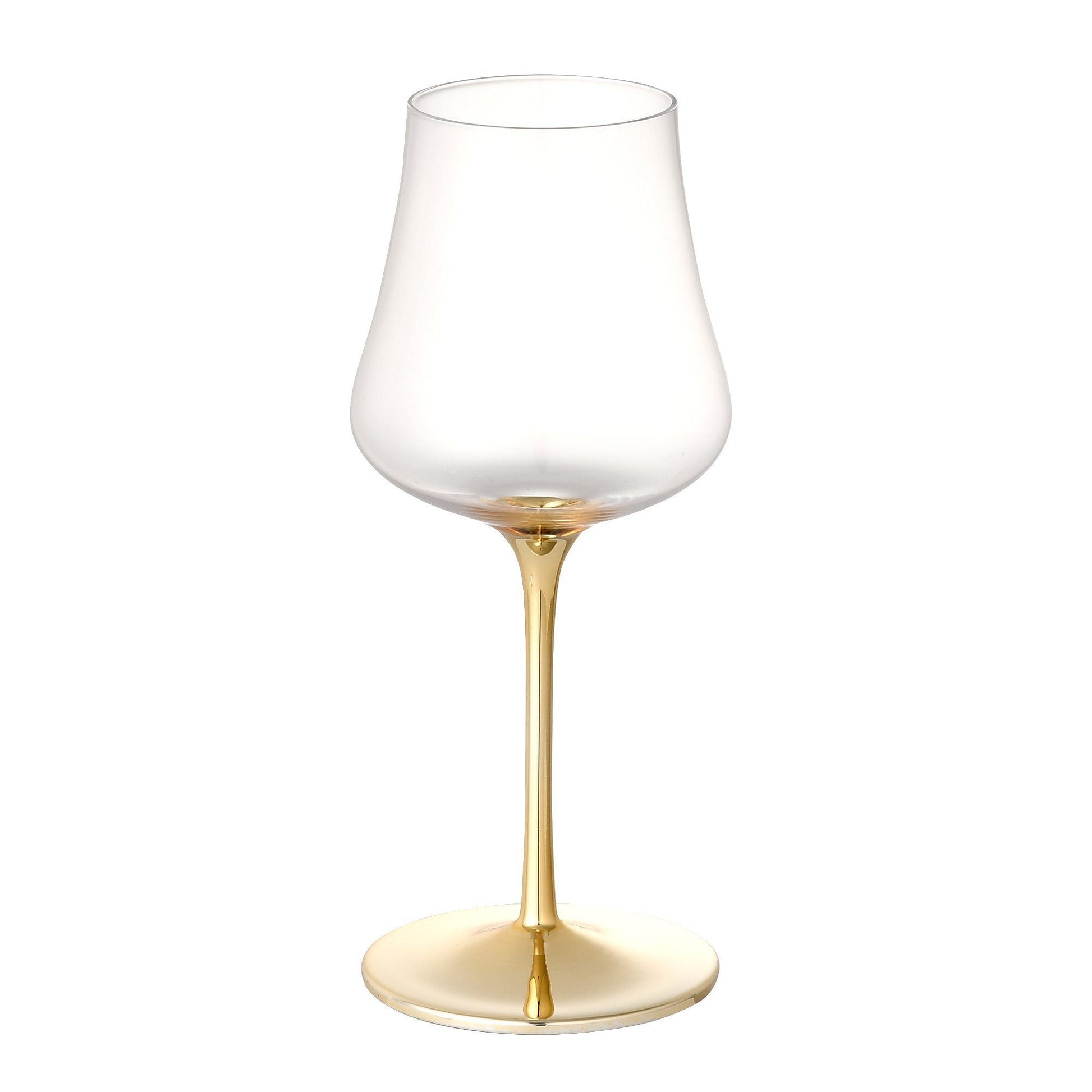 An elegant wine glass with rounded bottom and smooth curves.It has a simple but moderate presence with gold on a narrow stem, and colors the party gorgeously.