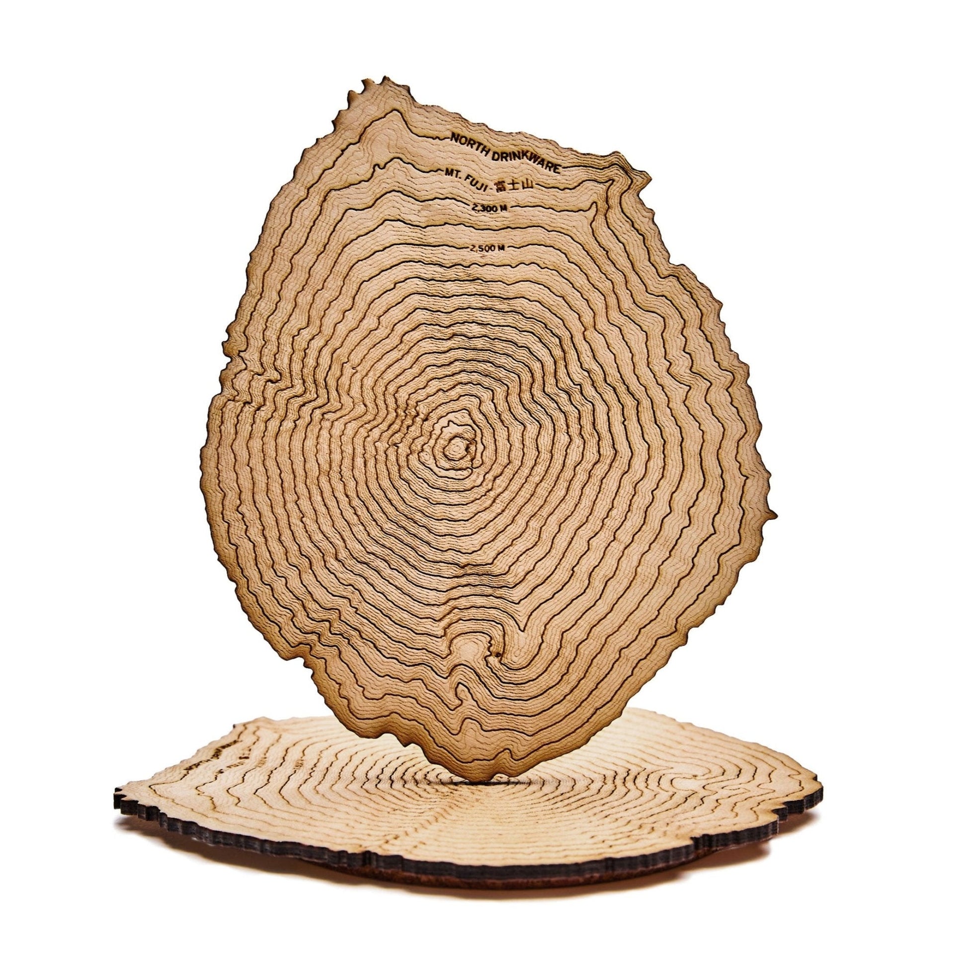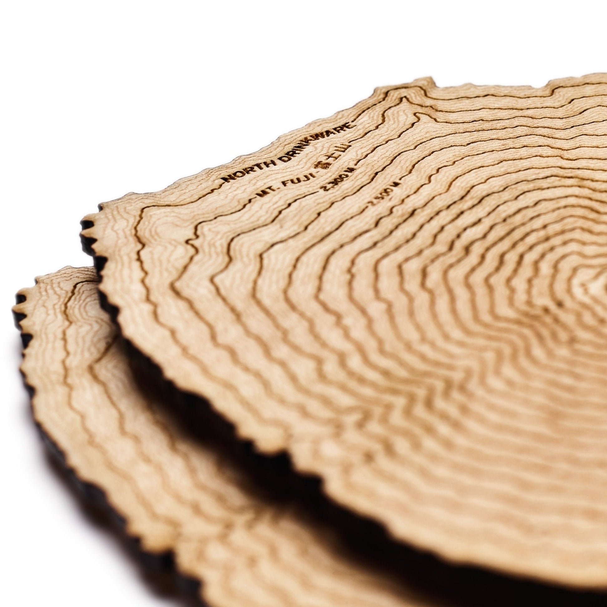 Custom wood coasters featuring accurate topographic data for Mt. Fuji, Japan. The iconic symmetry of this global landmark comes to life in our coasters. Set of 2 coasters of laser-cut birch ply with a cork backer. Made in USA and packaged in custom muslin bag.