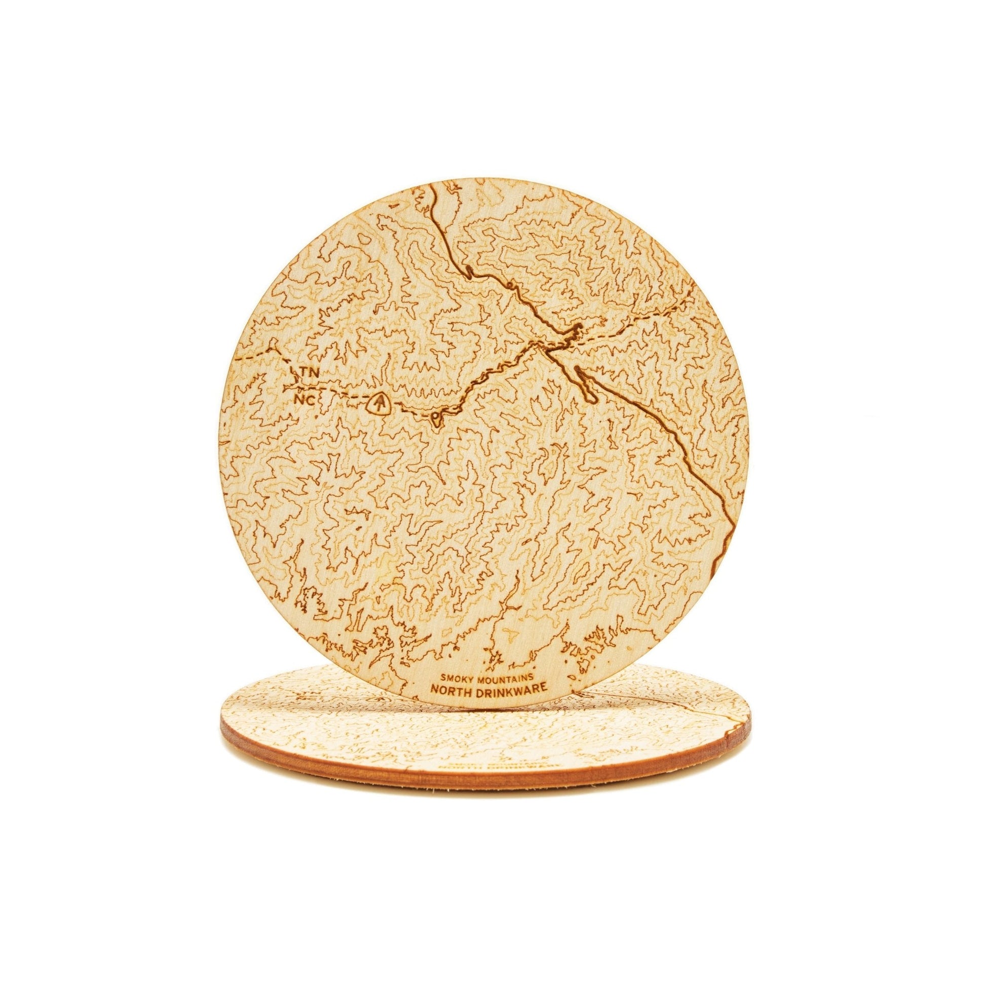Custom wood coasters featuring USGS topographic data of the core of the Great Smoky Mountains National Park. Details of Kuwohi, the Newfound Gap Road, and Mt. Le Conte in every coaster. We also highlight a magical stretch of the that follows the Tennessee / North Carolina state line. Set of 2 coasters of laser-cut birch ply with a custom-cut cork backer. Made in the USA and packaged in a custom muslin bag.